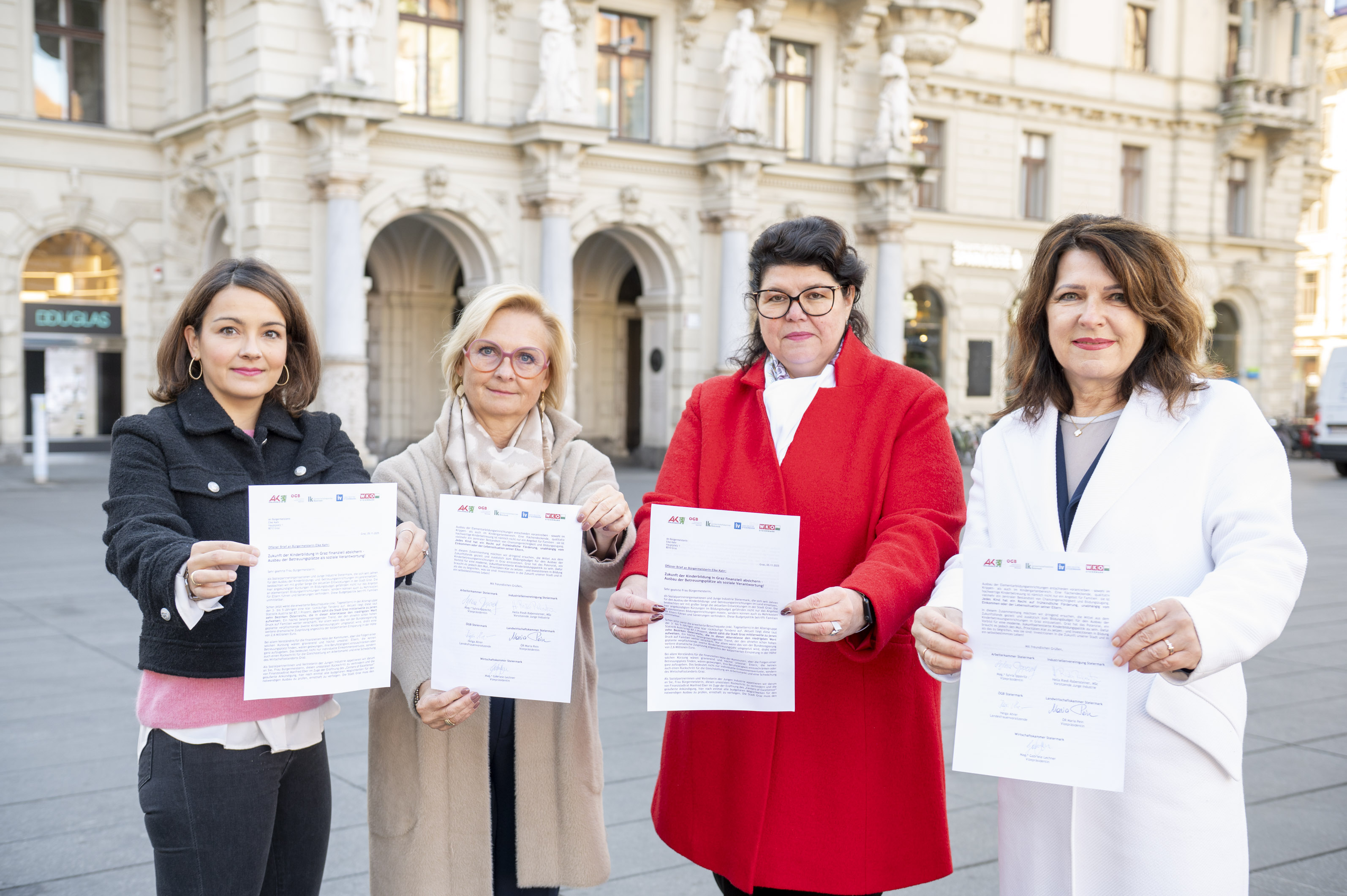 Fordern von Bürgermeisterin Elke Kahr die finanzielle Absicherung der Kinderbildung in Graz: Hella Riedl-Rabensteiner Vorsitzende Jungen Industrie), Gabi Lechner (Vizepräsidentin WKO Steiermark),…